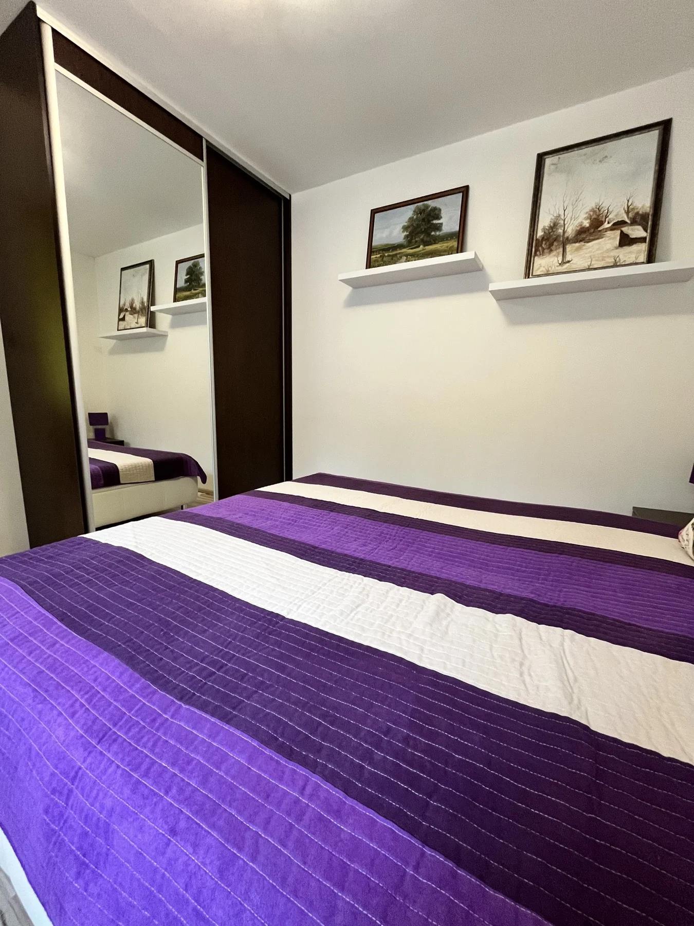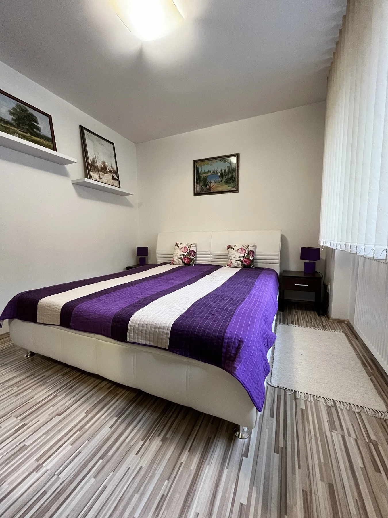 Spálňa disponuje s manželskou posteľou, nočnými stolíkmi a veľkou skriňou.